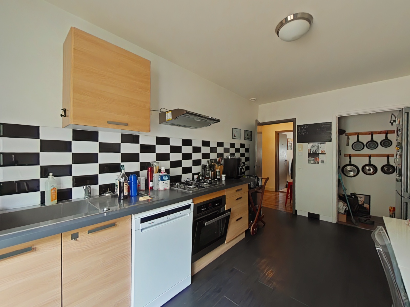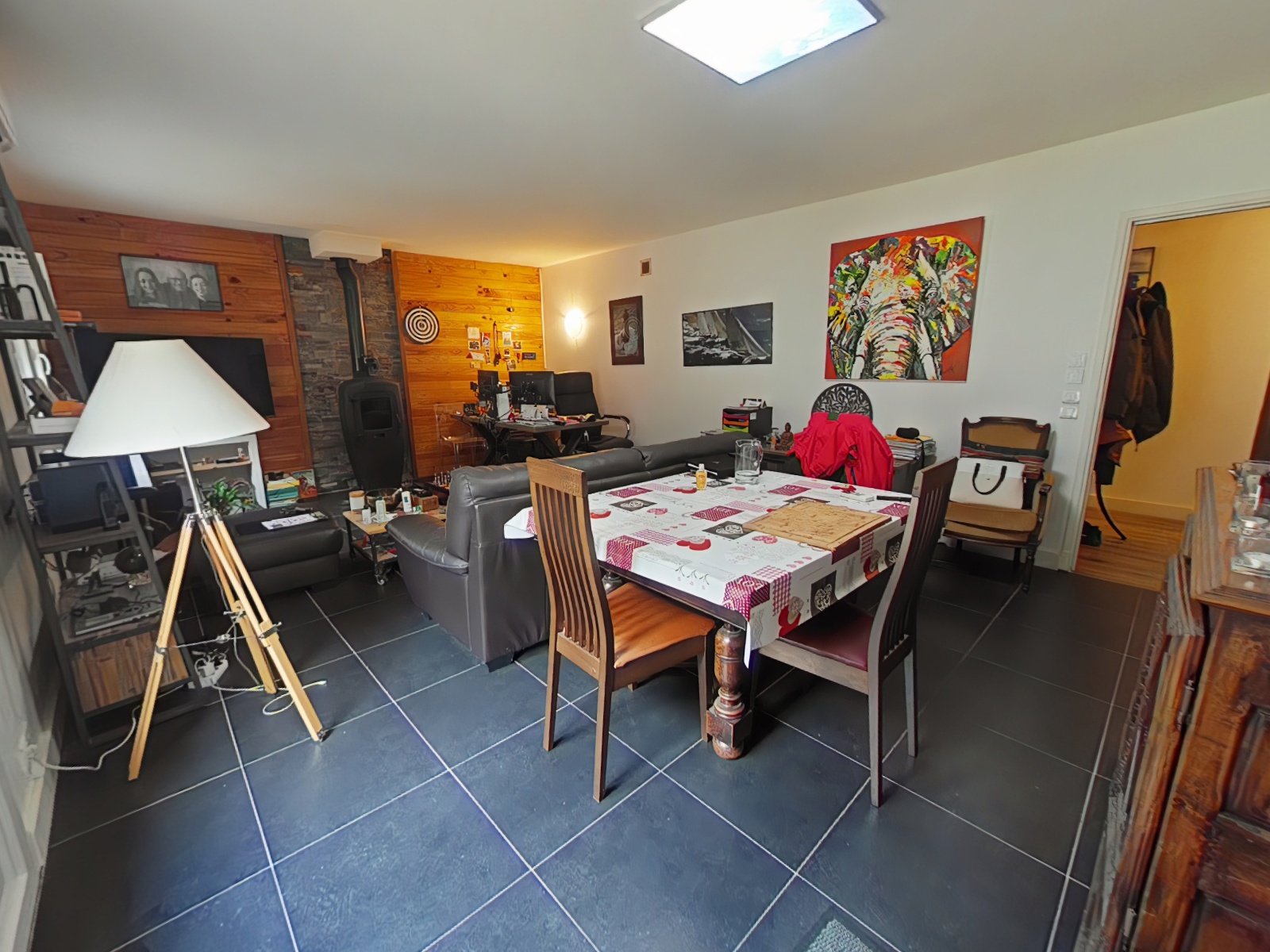 À l’étage, le palier de vie principal distribue une cuisine aménagée, un salon avec poêle à bois, trois chambres, un WC séparé, et une salle d’eau.